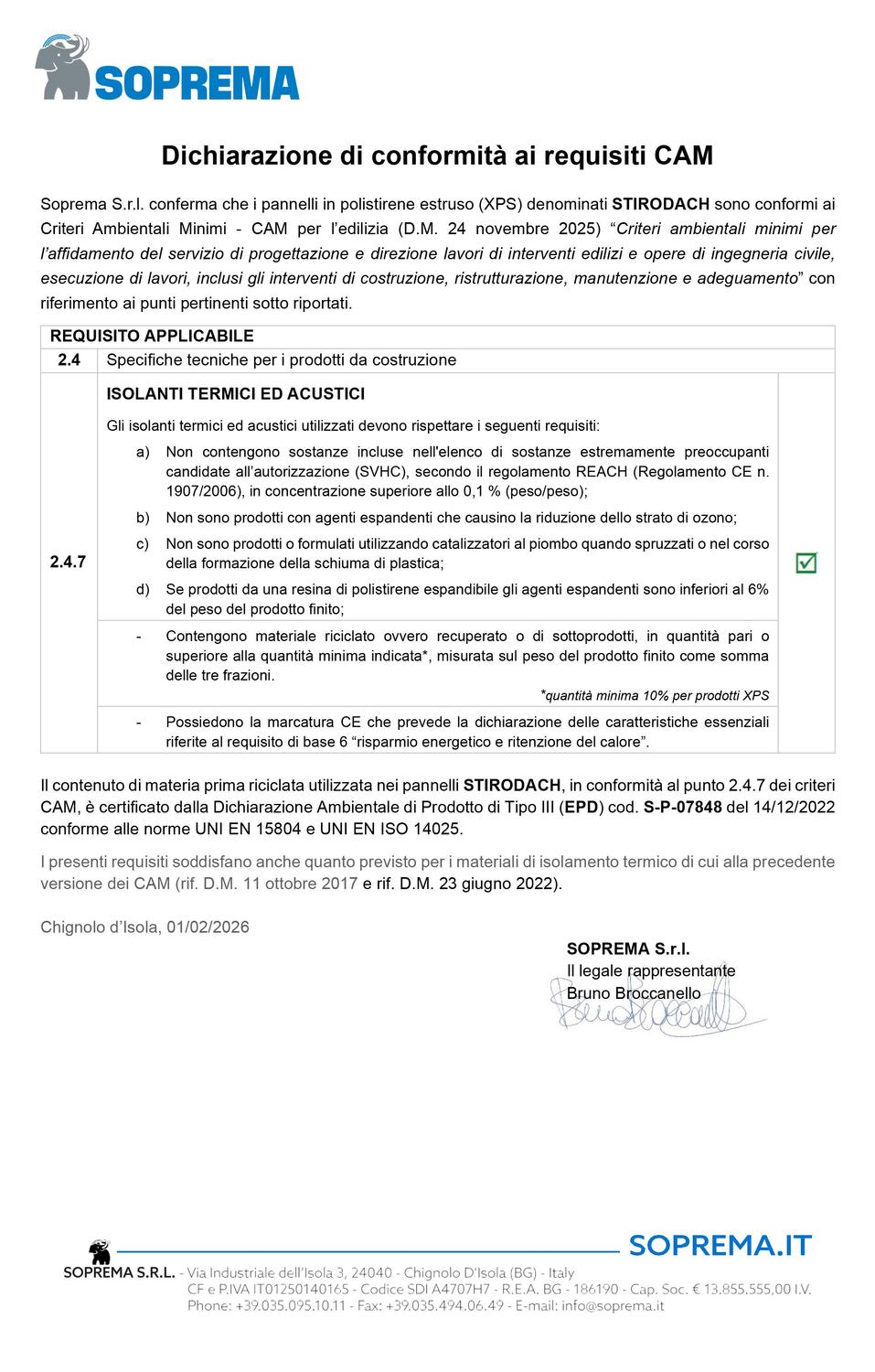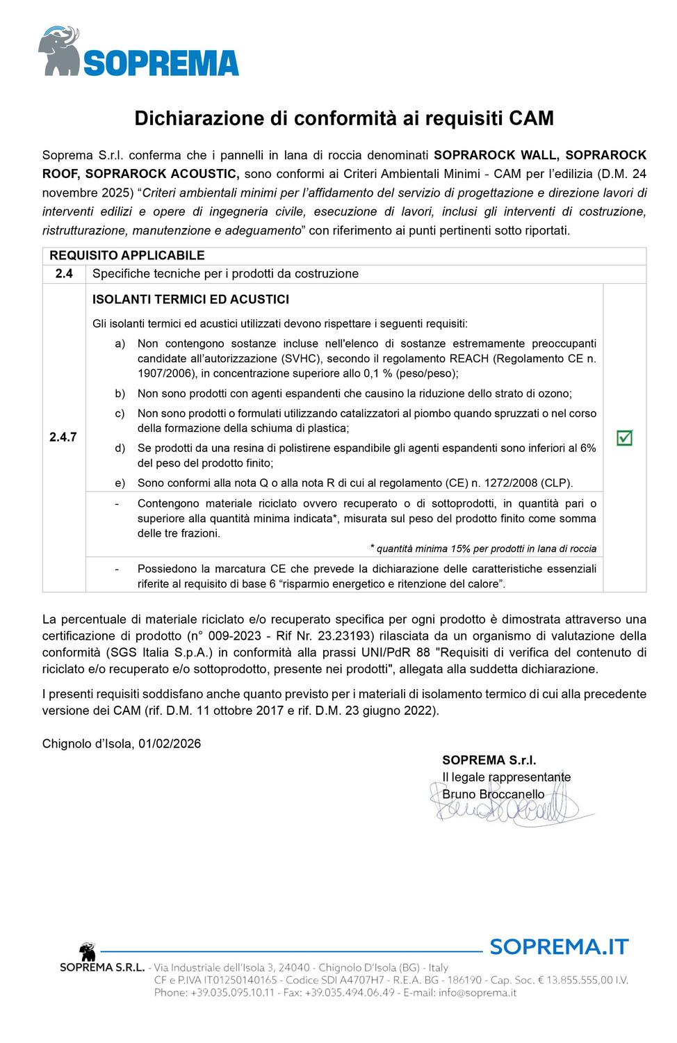 Scarica di seguito le dichiarazioni di conformità ai requisiti CAM e scopri tutti i prodotti conformi sviluppati da Soprema.