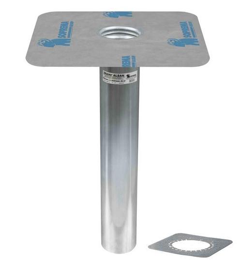 Bocchettone per lo scarico delle acque pluviali per coperture-terrazze impermeabilizzate. E' composto da un foglio impermeabile in tessuto non tessuto con lamina interna in poliammide prea-asemblato a tenuta su un tronco di tubo cilindrico in alluminio brevettato.